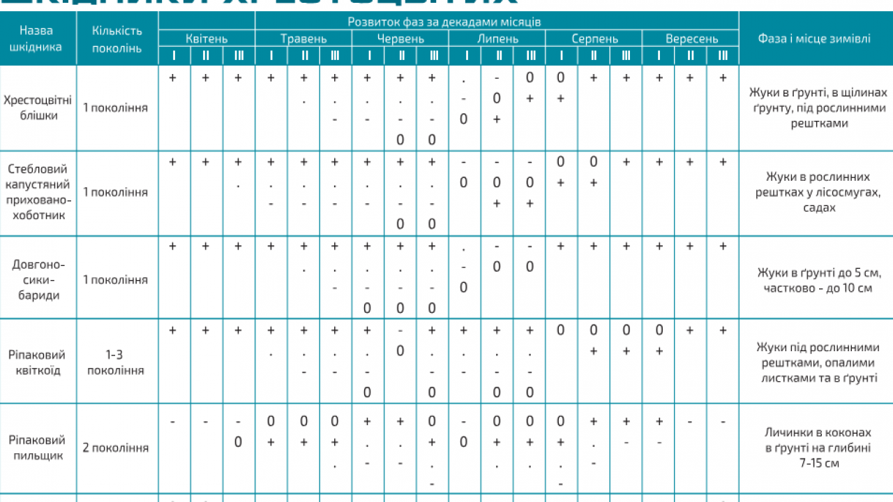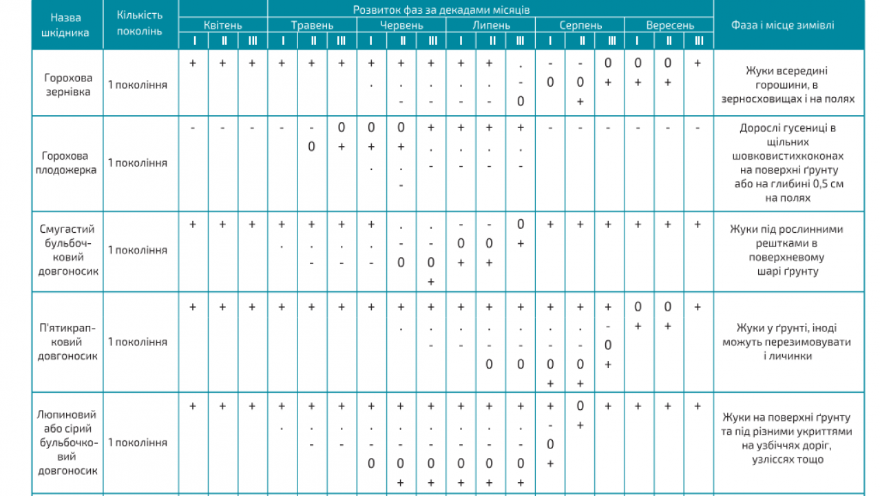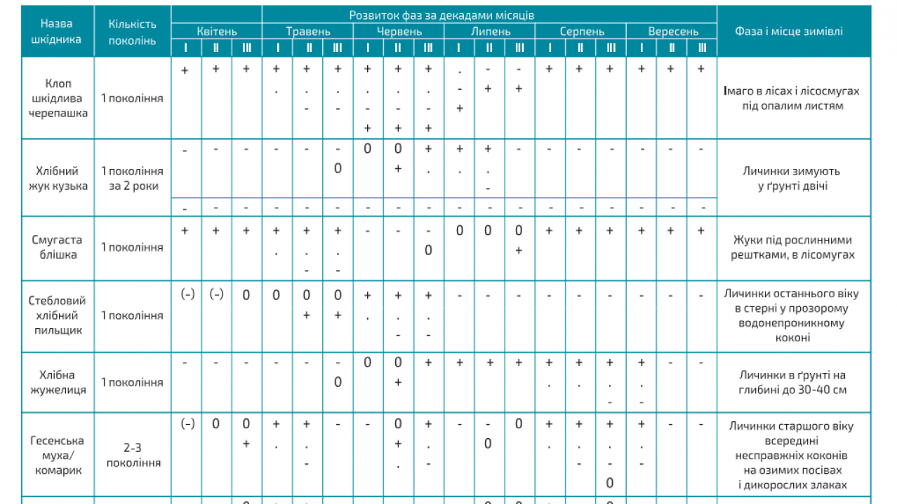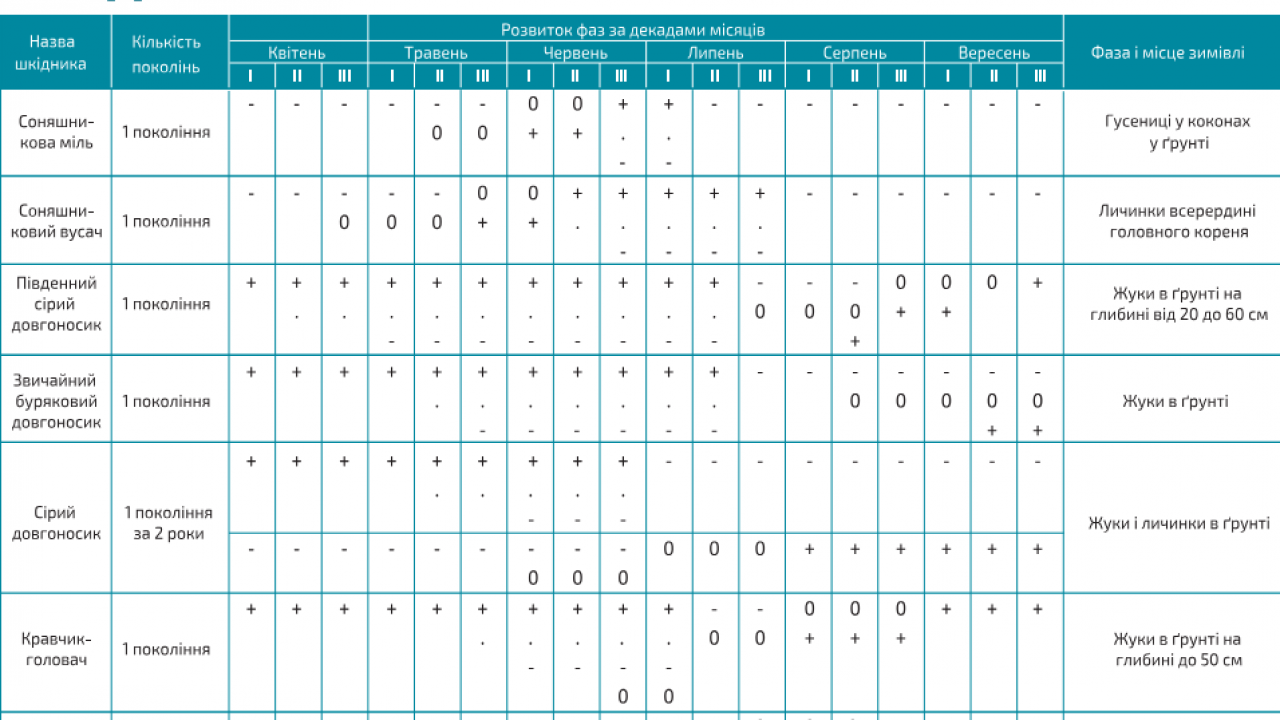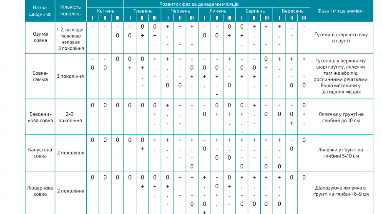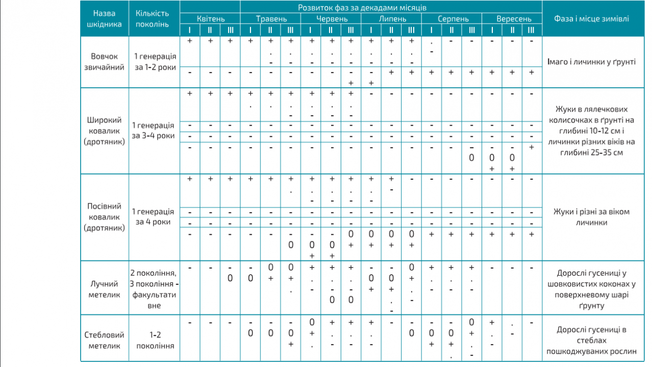 Далі у таблиці наведено дані по основних видах шкідників для центральної частини України. Для інших регіонів потрібно зміщувати фенофази на одну-дві декади вперед чи назад. На півдні та південному сході можливі відхилення на 10-12 днів раніше, північні регіони будуть недобирати по ефективній температурі на 5-7 днів, західні – на 7-10 днів. На успішність розвитку того чи іншого виду шкідників мають вплив багато факторів: температурні коливання, гідротермічний коефіцієнт, зволоженість та глибина промерзання ґрунту, наявність патогенних для комах мікроорганізмів, паразитів, шкідників і т.д. Тому для кожного поля окремо важливо