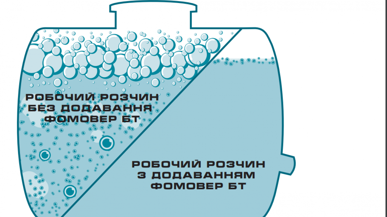 - Щоб піна не утворювалася під час приготування робочого розчину необхідно заповнити бак обприскувача на 1/3-1/4 водою при постійному перемішуванні та додати Фомовер БТ – 5-15 мл (залежно від жорсткості води) на 100 л води. Після цього треба додати засоби захисту та дозаповнити бак оприскувача водою.